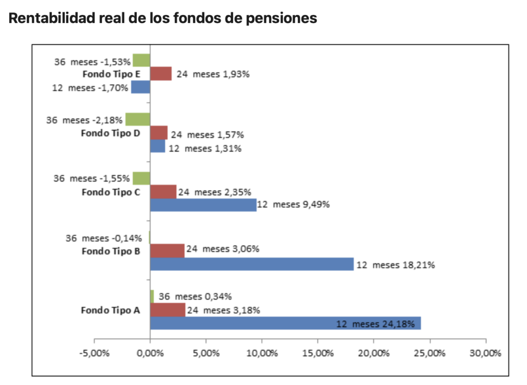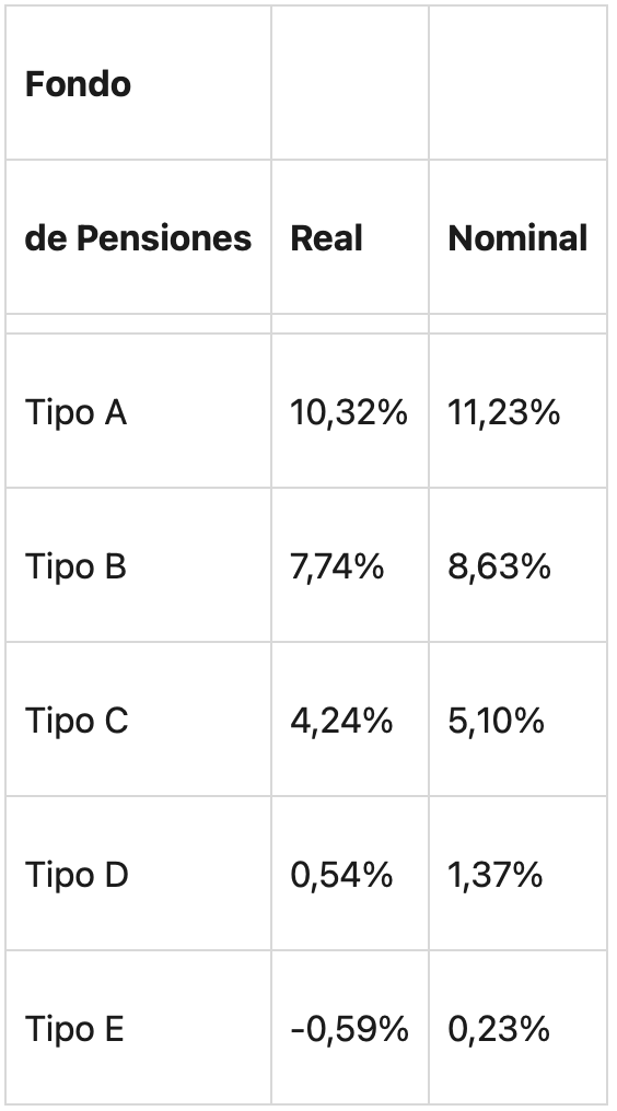 Siguiendo al Fondo Tipo A, encontramos que el Fondo Tipo B, con una ganancia del 1,73%, y el Fondo Tipo C, con un 1,49%, también han cerrado el mes en territorio positivo. Estos fondos tienden a tener una mezcla de inversiones en renta fija y variable, equilibrando riesgo y retorno para los afiliados.