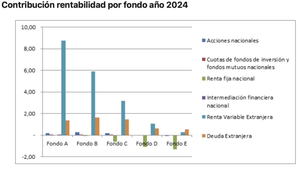 Para los Fondos Tipo D y E, la rentabilidad ha sido positivamente afectada por la caída en las tasas de interés de los bonos locales. Este escenario ha facilitado ganancias de capital significativas para estos fondos, que tienen una orientación más inclinada hacia la renta fija.